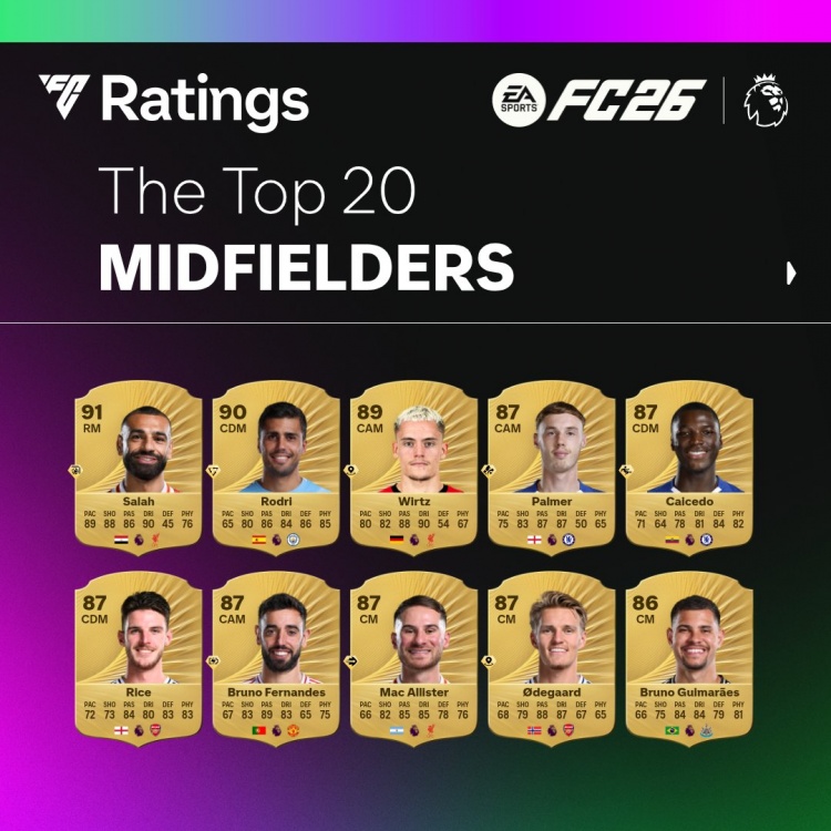 FC26官方英超中场评分榜:萨拉赫91居首,罗德里90、维尔茨89