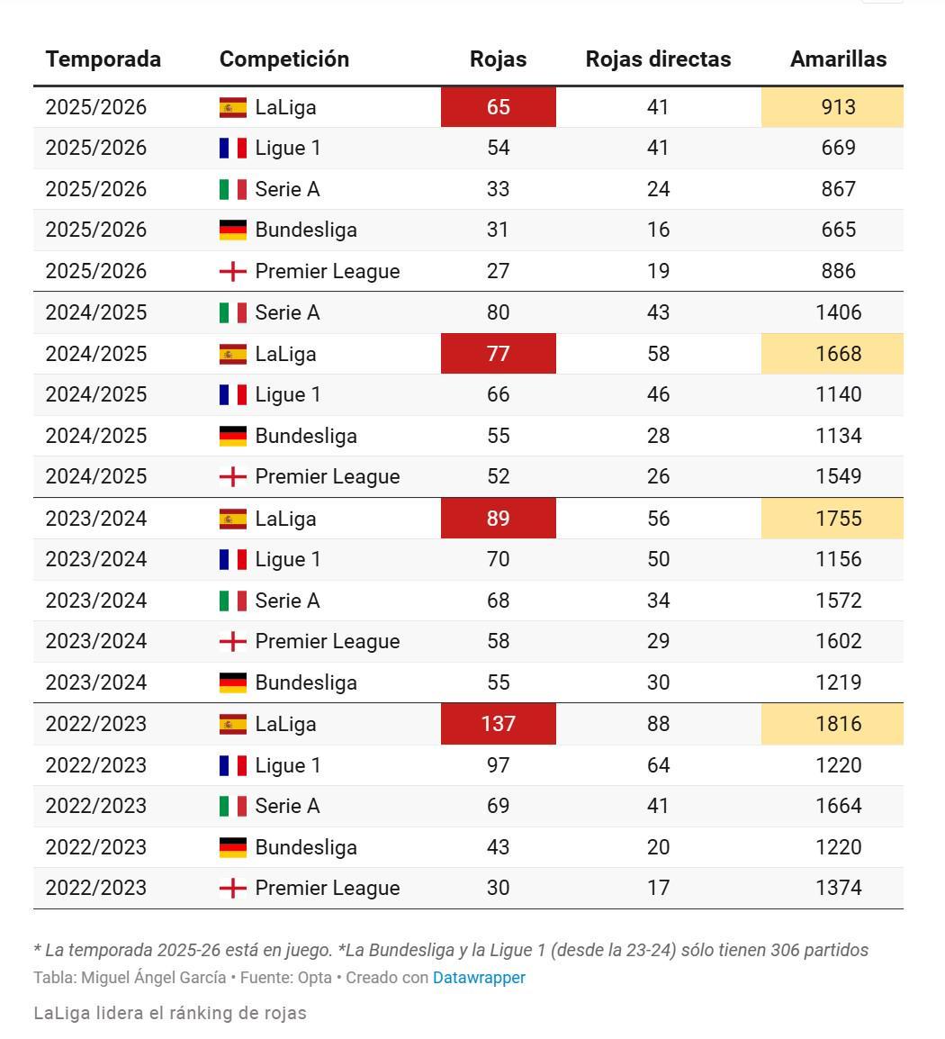 据《马卡报》报道,西甲本赛季红牌数已累计达65张,高居五大联赛之首。若趋势延续,全年红牌总数预计将突破110张。